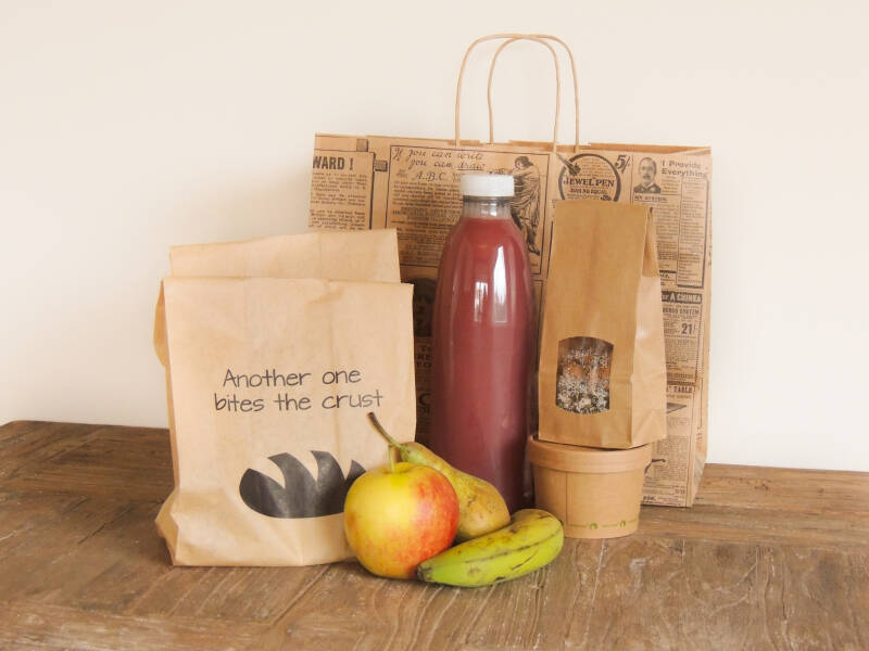 3/ Ontbijtzak voor 2 personen door Boetiek Angeliek met: zelfgemaakte granola, yoghurt, fruitsla, 6 mini koffiekoekjes, 6 gember-havermoutkoekjes en fruitsap. Allemaal met liefde gebakken en vrij van lactose, gluten en geraffineerde suikers.